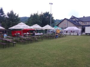 Zapewniamy namioty, parasole oraz komplety ławostołów dla gości.